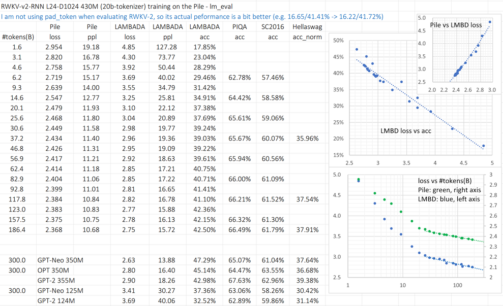 I am training a L24-D1024 RWKV-2 on the Pile (https://github.com/BlinkDL/RWKV-v2-RNN-Pile):