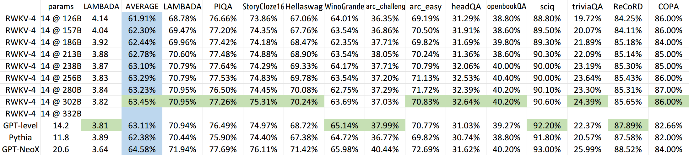 Now training RWKV-4a with one single tiny extra attention (just a few extra lines comparing with RWKV-4) to further improve some difficult zeroshot tasks (such as LAMBADA) for smaller models. See