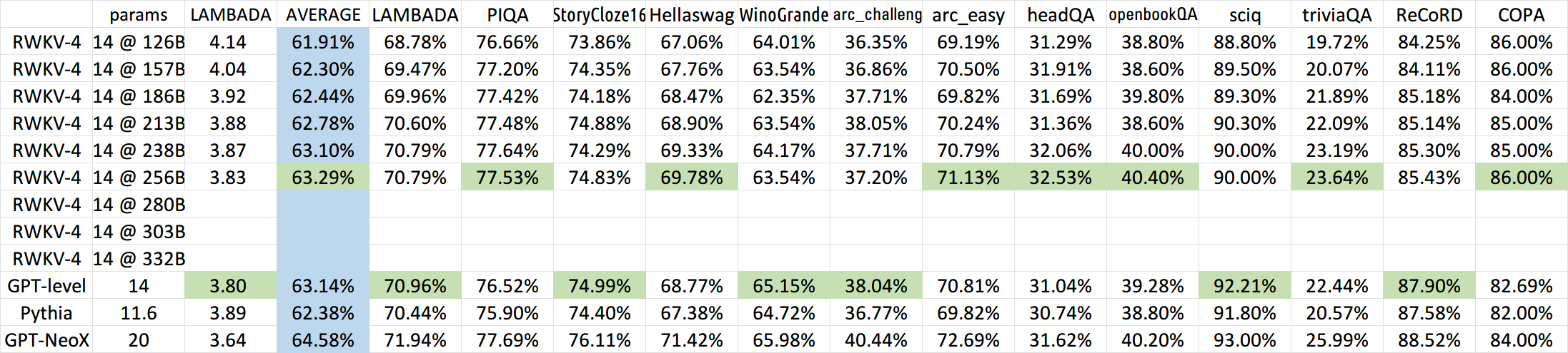 • Now training RWKV-4a with one single tiny extra attention (just a few extra lines comparing with RWKV-4) to further improve some difficult zeroshot tasks (such as LAMBADA) for smaller models. See a268cd2e40