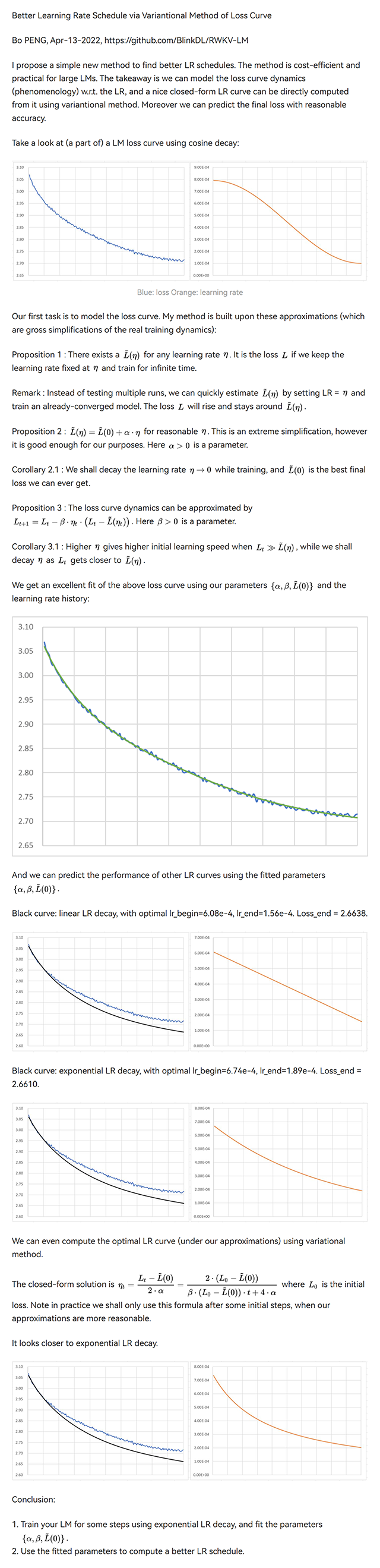 I propose a simple new method to find better LR schedules. The method is cost-efficient and practical for large LMs. The takeaway is we can model the loss curve dynamics (phenomenology) w.r.t. the LR, and a nice closed-form LR curve can be directly computed from it using variantional method. Moreover we can predict the final loss with reasonable accuracy.