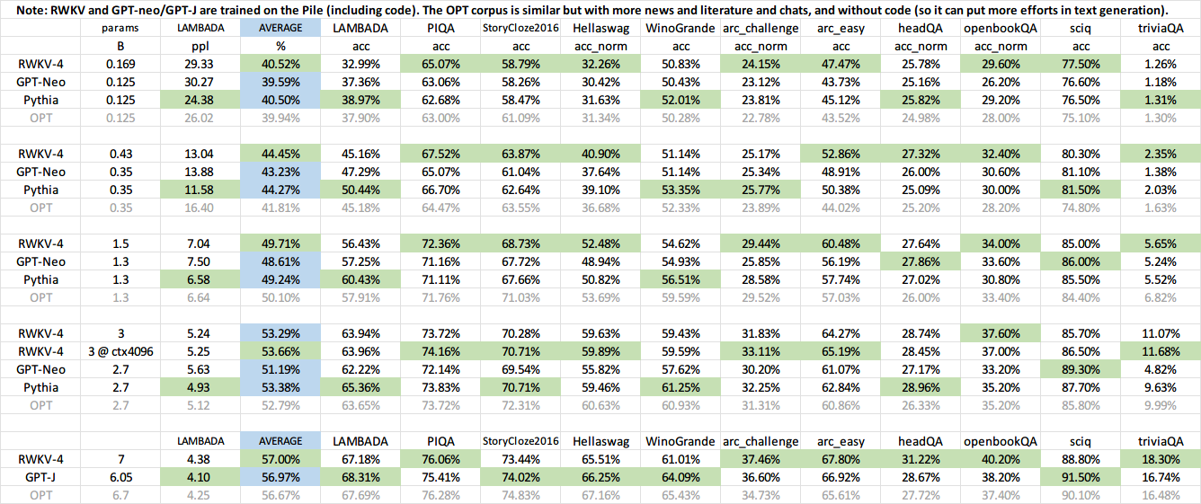 • Now training RWKV-4a with one single tiny extra attention (just a few extra lines comparing with RWKV-4) to further improve some difficult zeroshot tasks (such as LAMBADA) for smaller models. See a268cd2e40